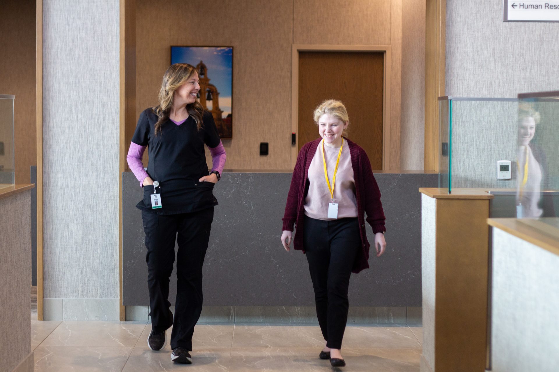 Nurse care coordinator, Angie Newman, RN, (left) and behavioral health therapist, Marissa Hagen, PLMHP, (right) walk down a hallway together at Community Alliance.